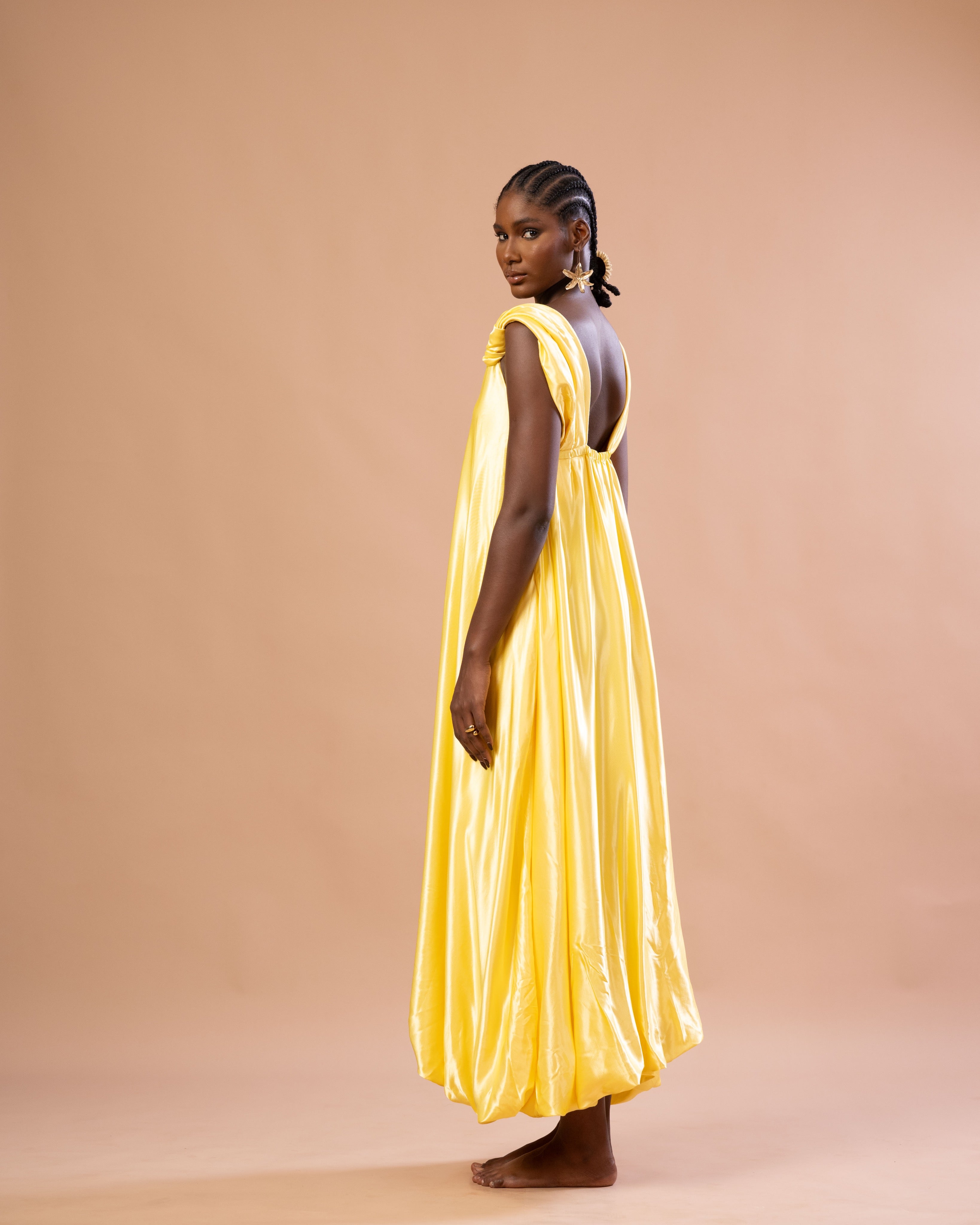 La robe JÀNT, du mot wolof signifiant soleil, célèbre la lumière. Sa coupe ballon fluide, ses nœuds imparfaits sur les épaules et ses poches discrètes composent une silhouette libre et radieuse.