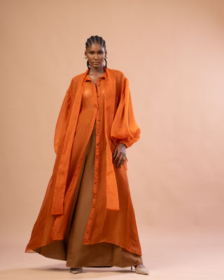 Ses manches bouffantes et son long col lavallière prolongent le geste, pour une silhouette fluide et affirmée. À porter sur un fond de robe ou un pantalon, ouverte ou ceinturée, pour une élégance libre.