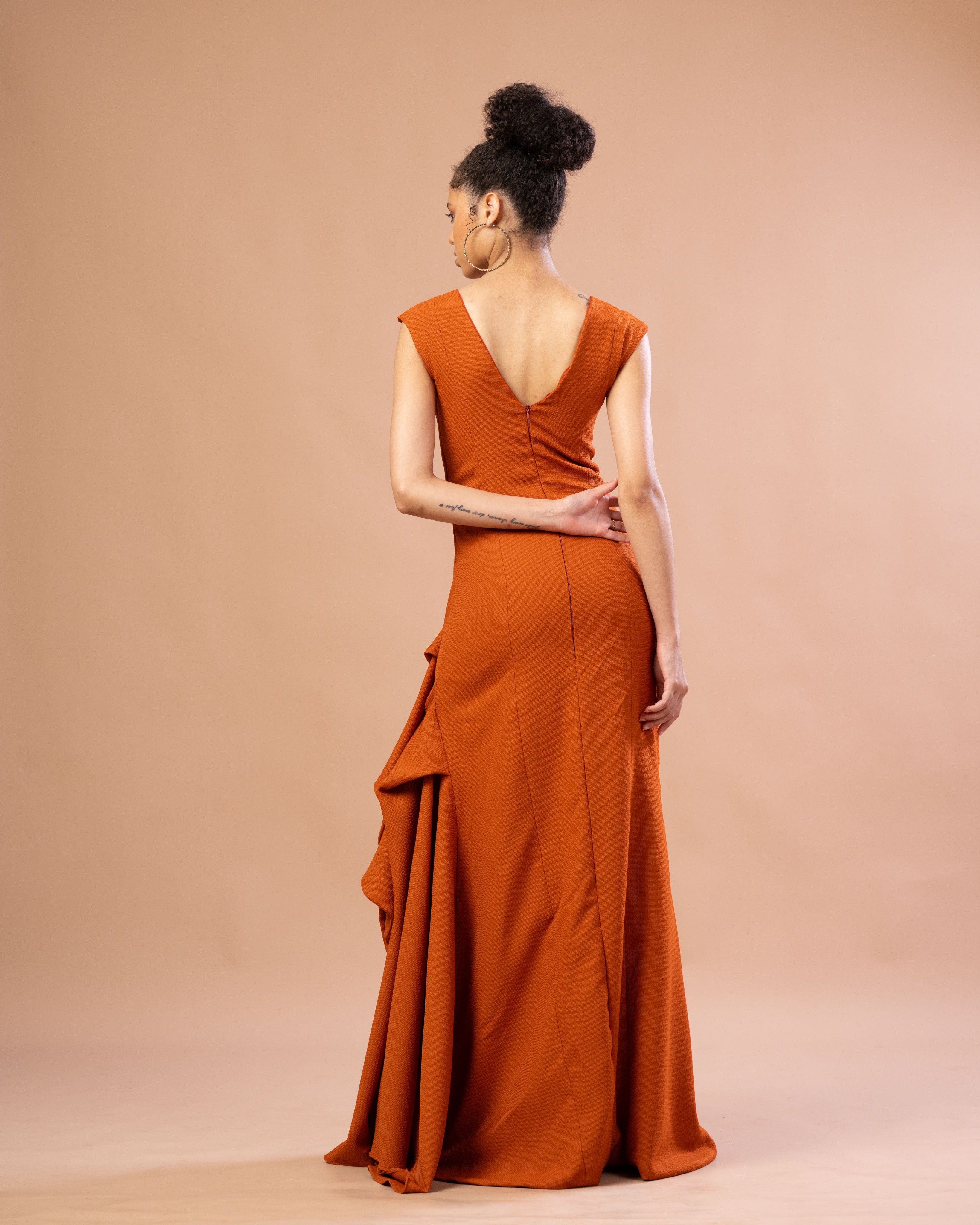 • La KERMEL, robe longue en tweed rouille, épouse le corps avec précision avant de se déployer en un drapé architectural sur la hanche. Sa fente subtile allonge la silhouette et révèle une sensualité maîtrisée.
