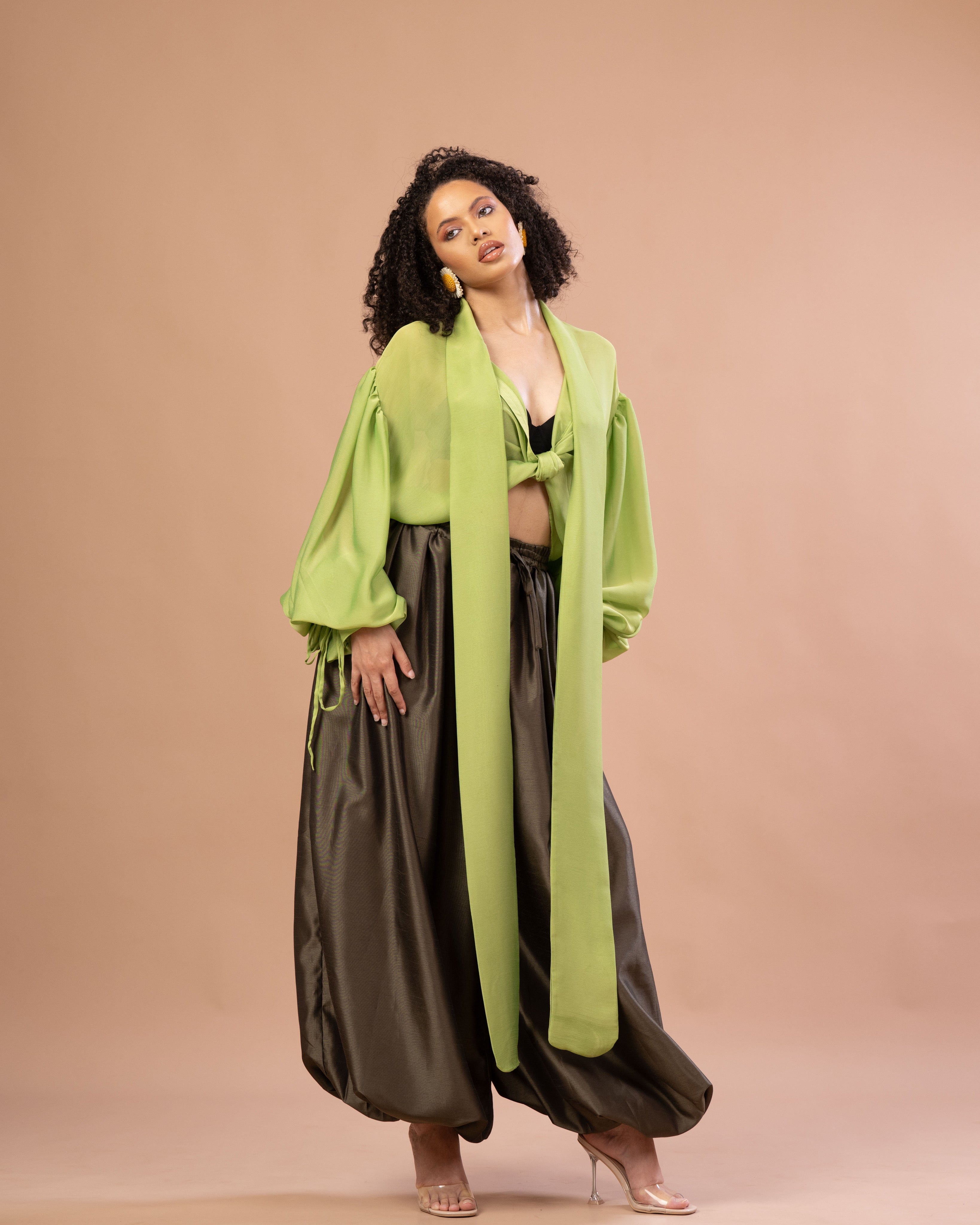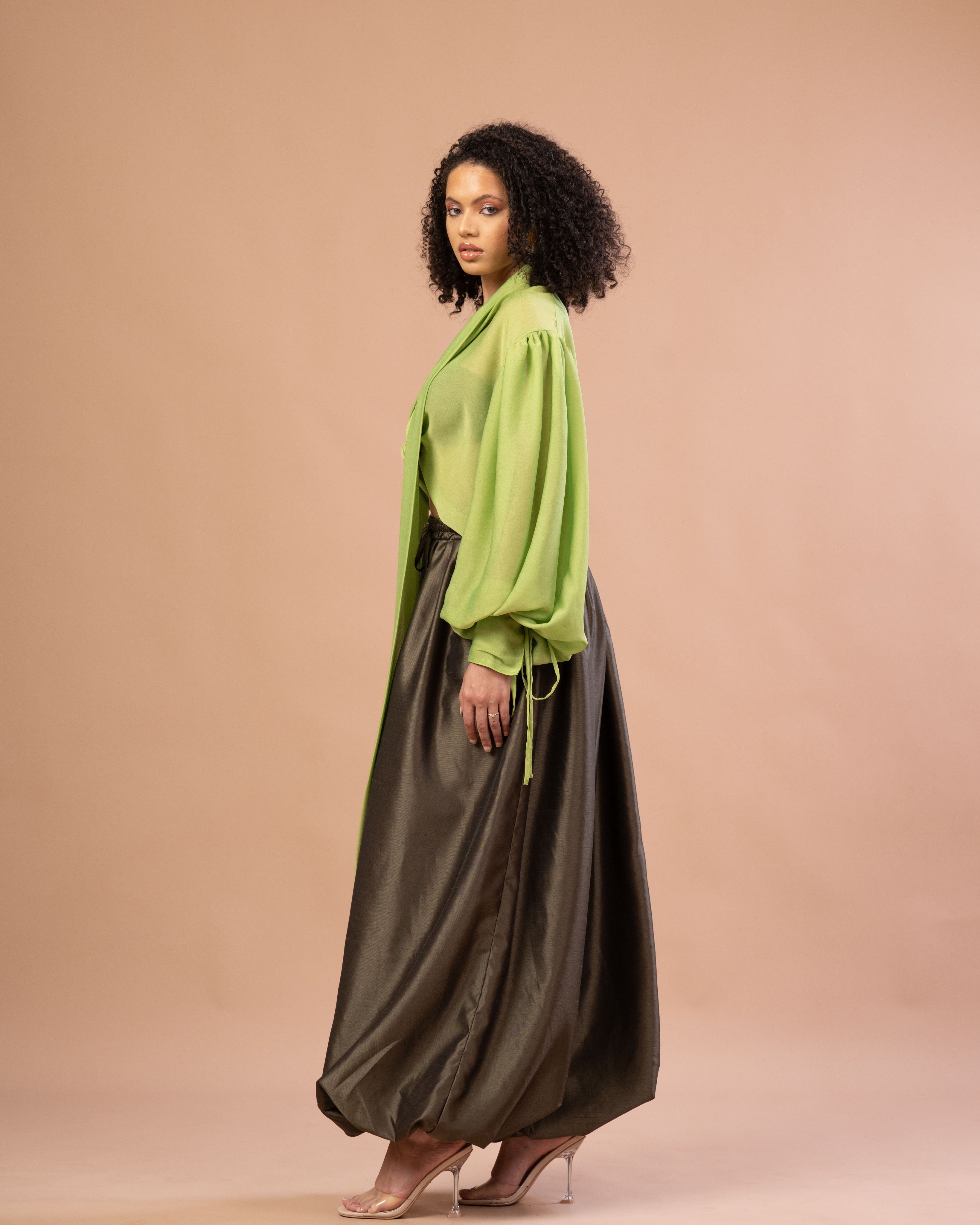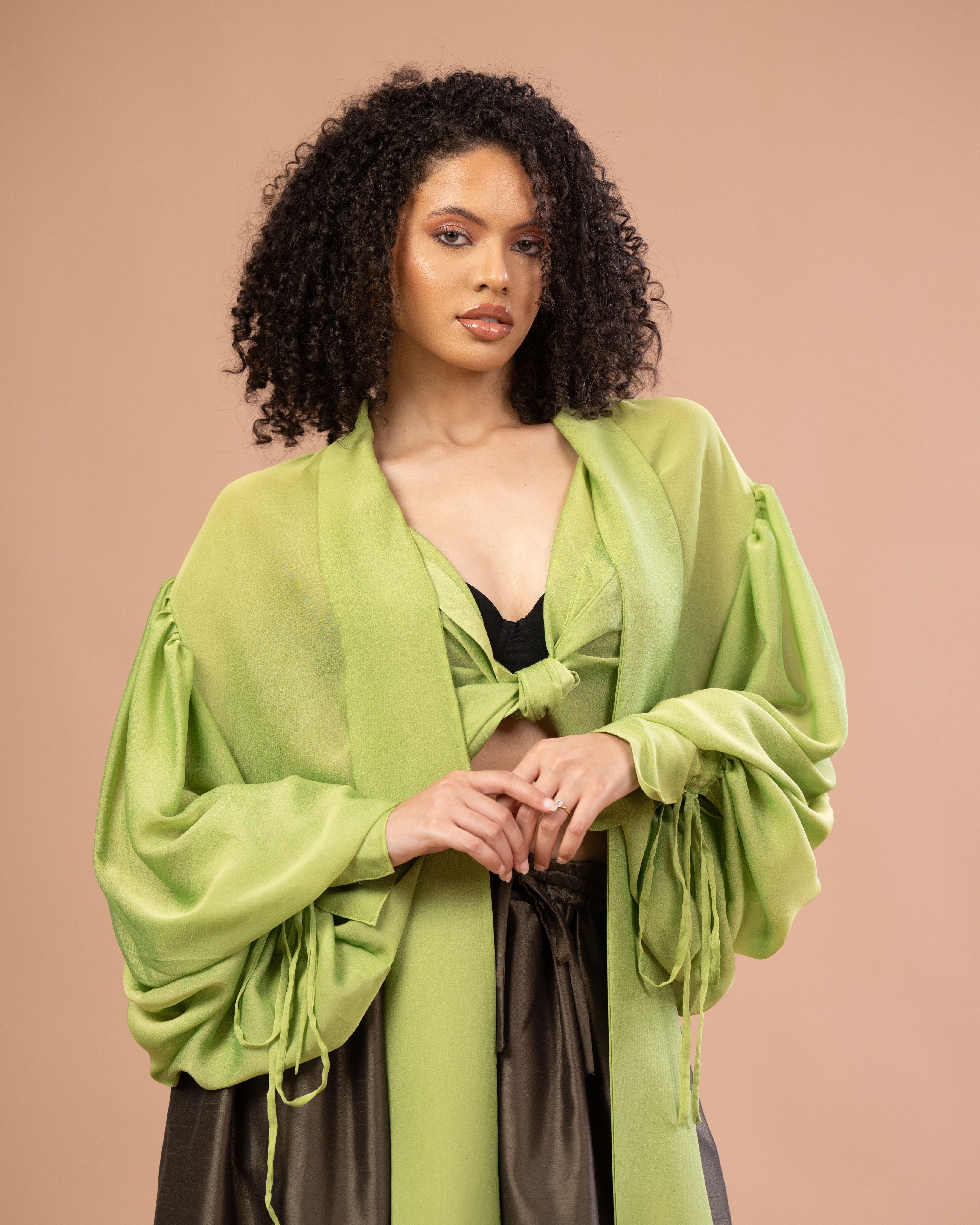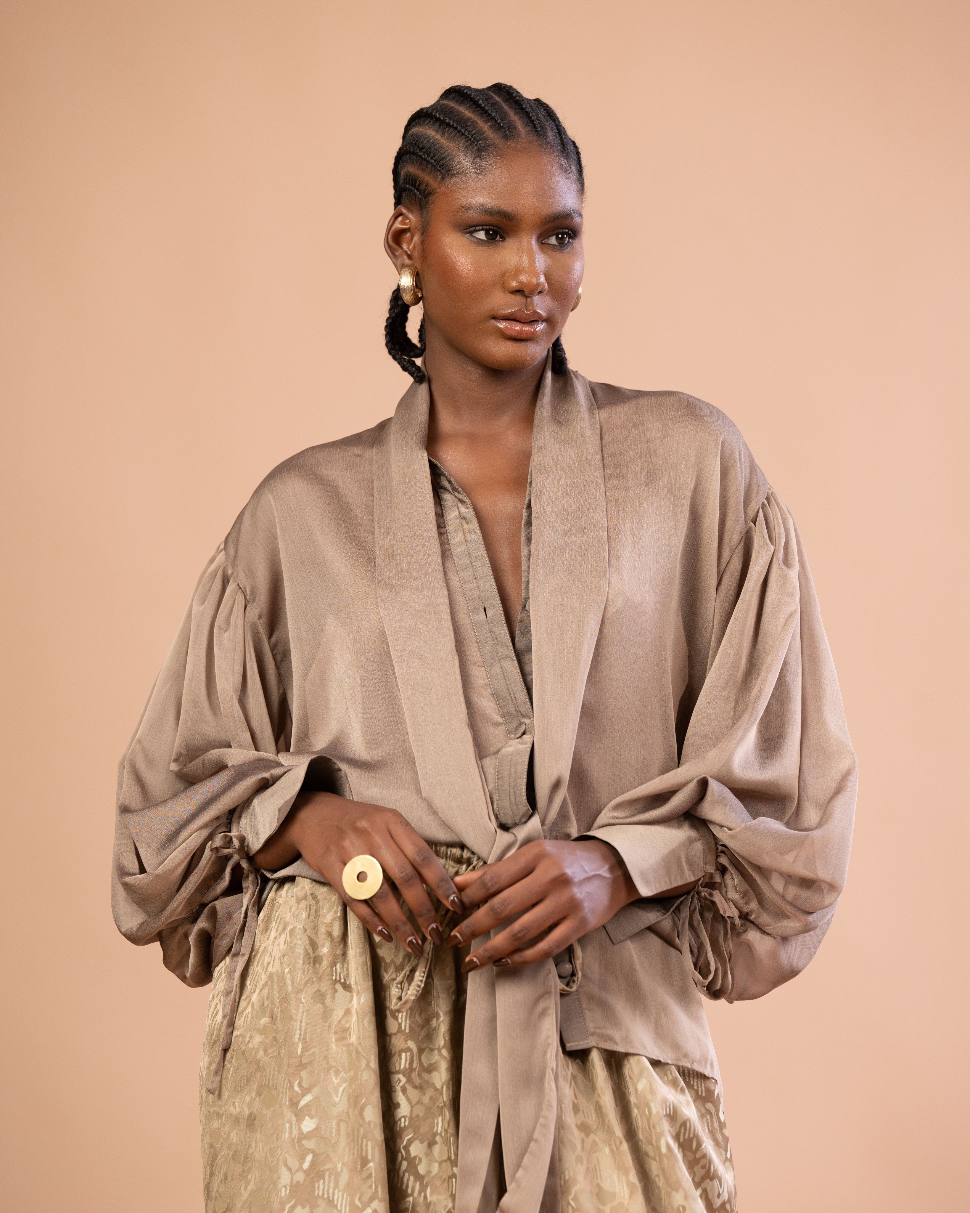 Fluide et aérien, le haut TERROU réinvente la chemise à travers une lavallière infinie et des manches bouffantes à liens ajustables. Sa coupe décalée, légèrement tombante sur l’épaule, évoque une élégance sans effort, un geste entre mouvement et douceur.