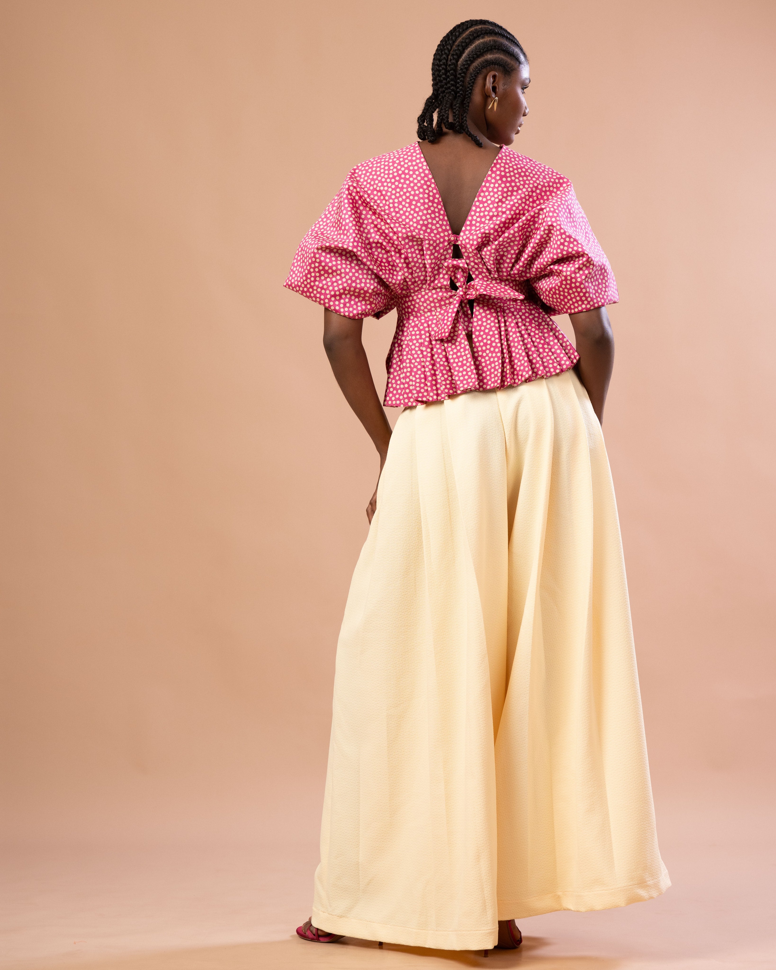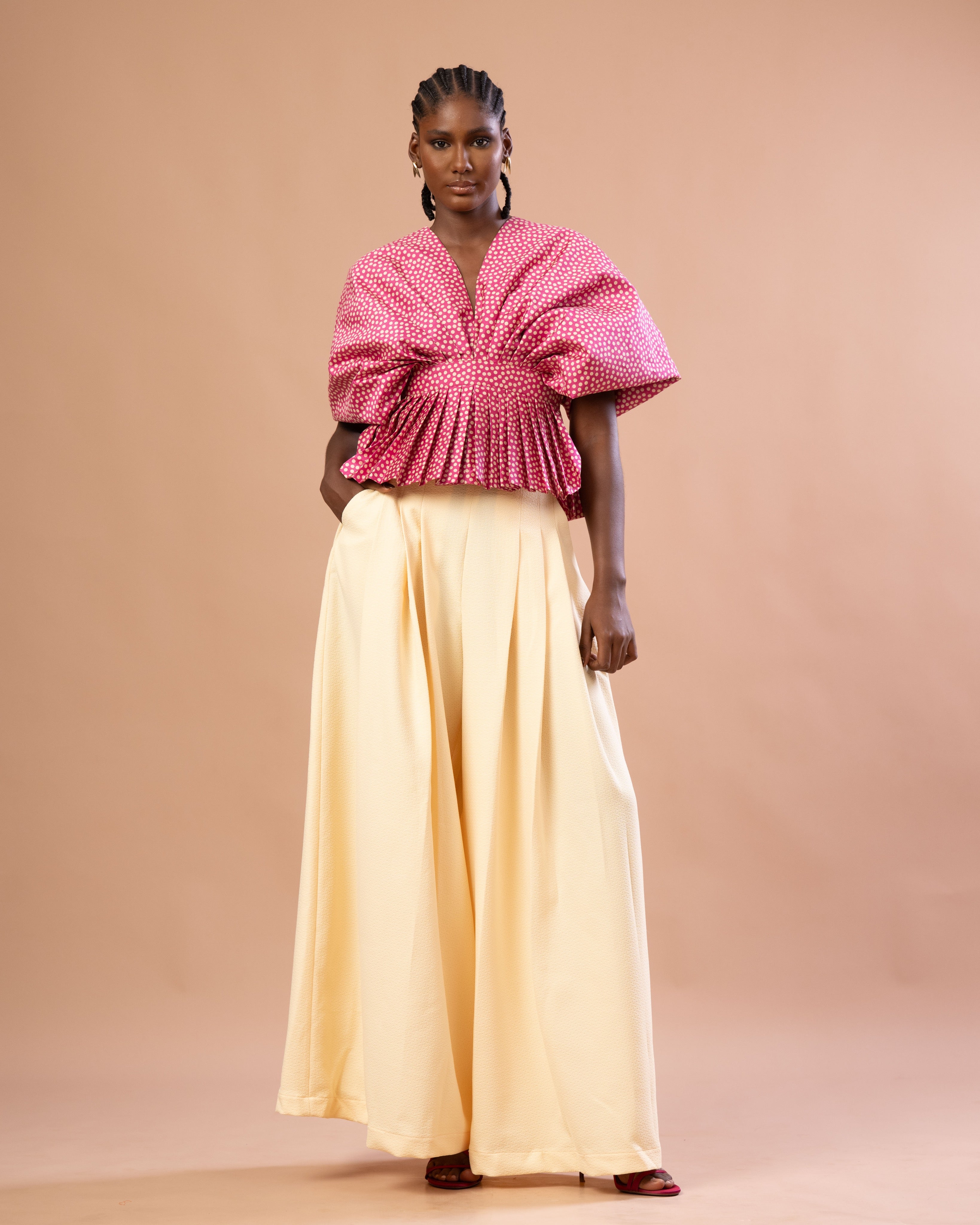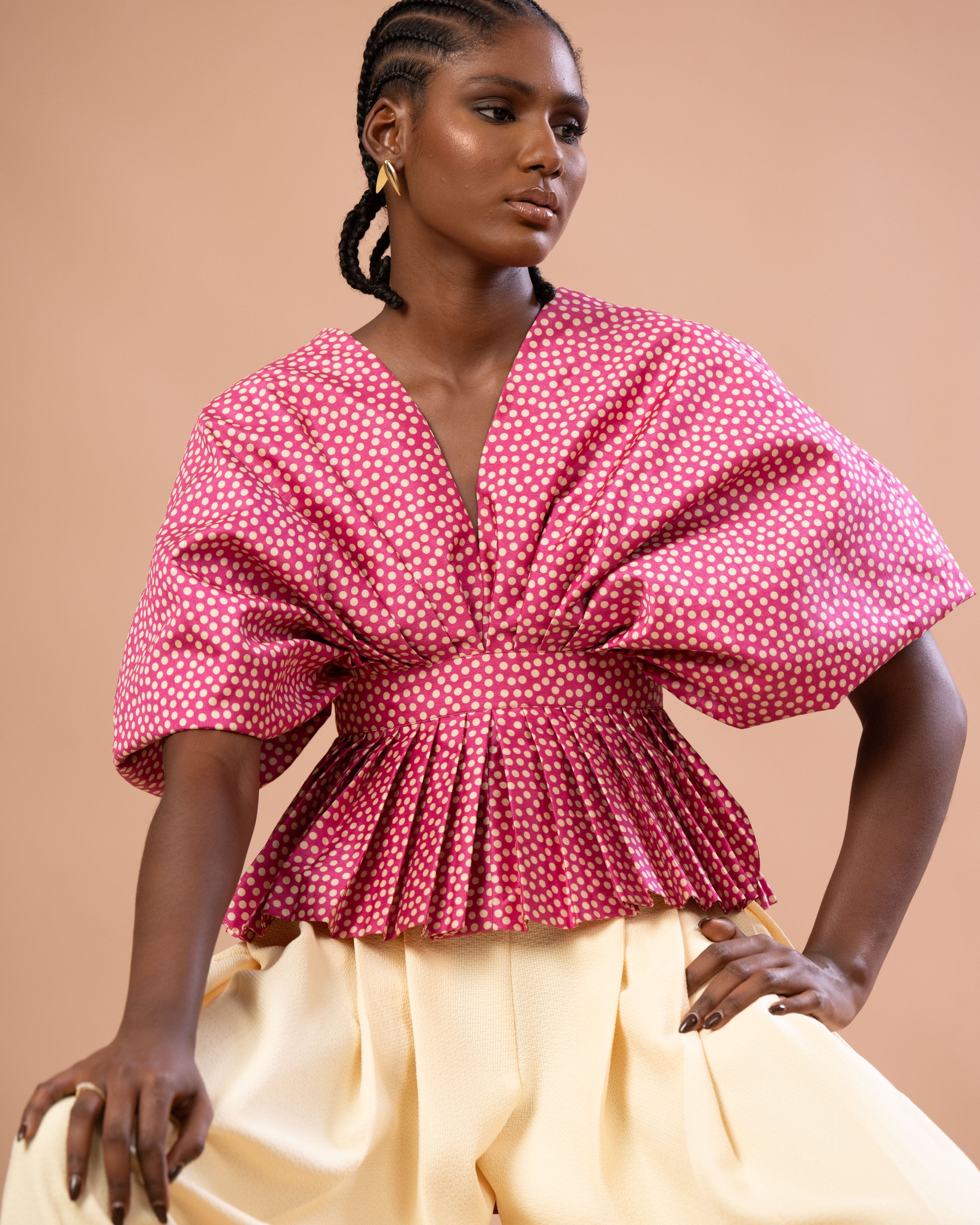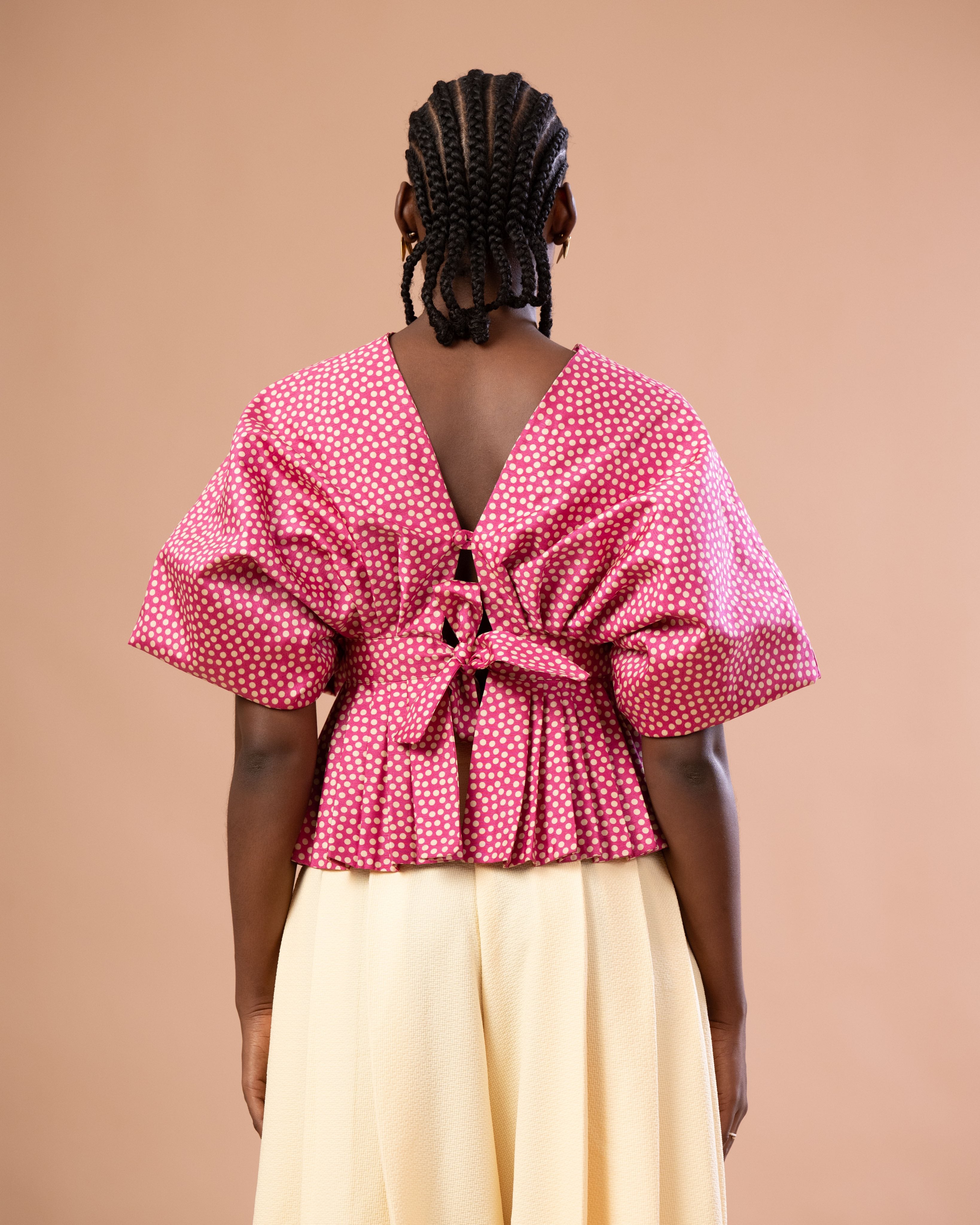 Notre haut signature WANTAÏ, revisite l’éventail traditionnel en une forme textile inédite : large tout en étant enveloppante.La silhouette se construit sur des manches-papillons grandioses, qui se déploient comme des ailes.
