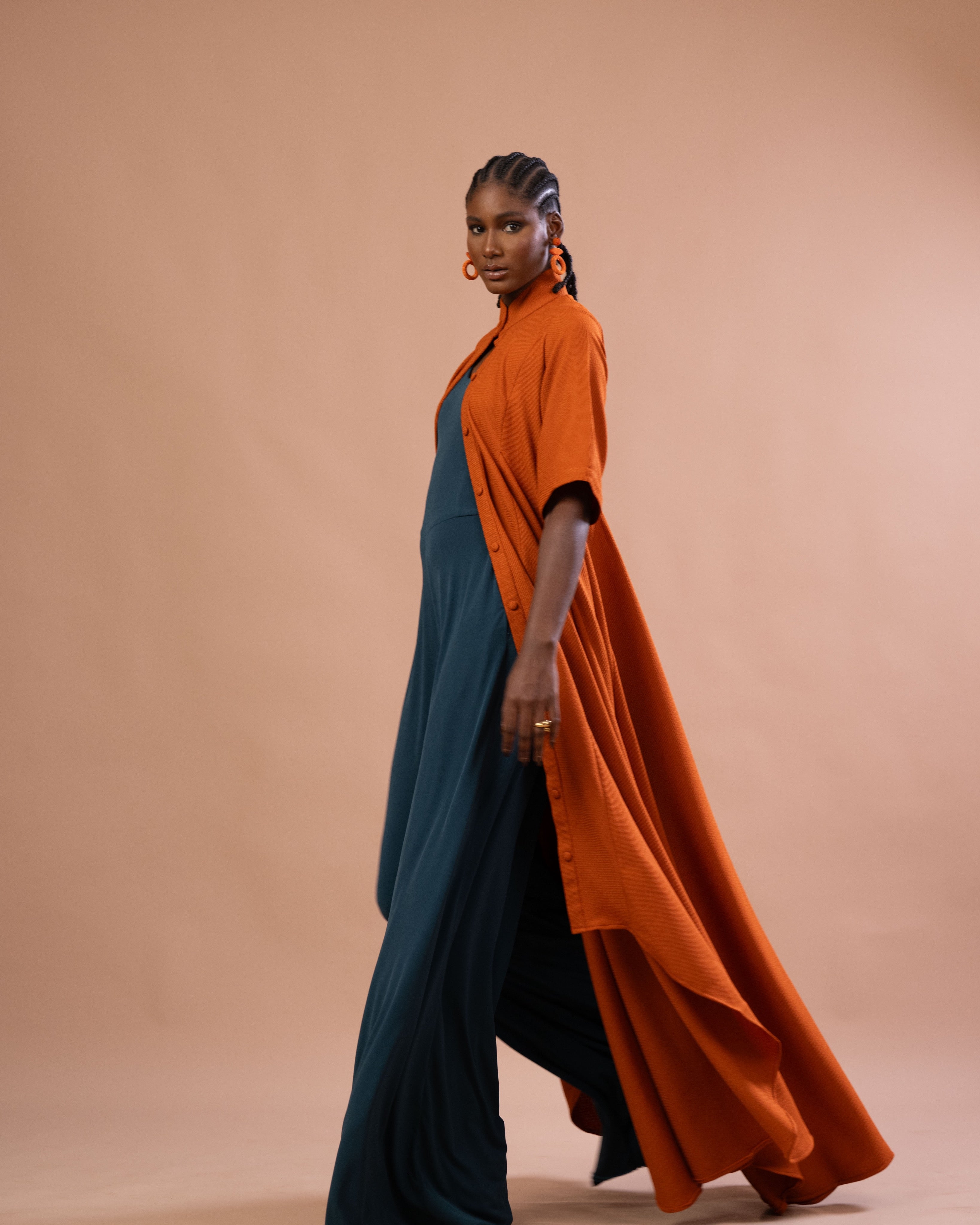 GUELWAAR s’impose par sa coupe structurée et ses volumes amples, sublimés par un tweed rouille à la texture noble. Son col officier et sa ligne boutonnée soulignent une prestance naturelle, tandis que le tombé en cascade sur les flancs et à l’arrière évoque la présence et l'élégance. Portée seule ou ouverte sur une combinaison en crêpe pour une allure élancée et résolument contemporaine.