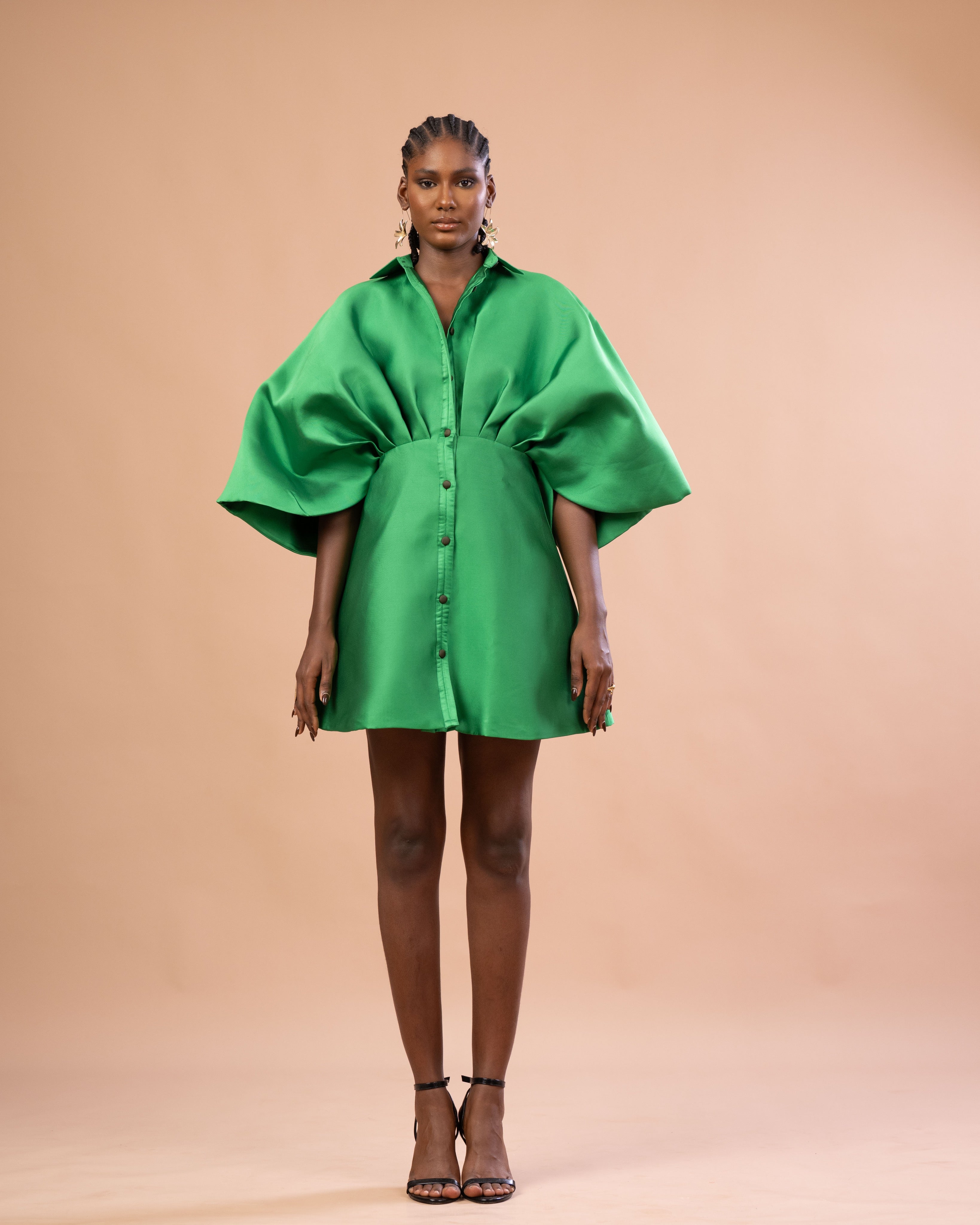 Mini-robe chemise à plis architecturaux, découvrez la SOUKAÏ avec ses volumes maîtrisés et la texture noble du tissu Mikado. Des épaules à la taille, les drapés dessinent une allure entre structure et sensualité.